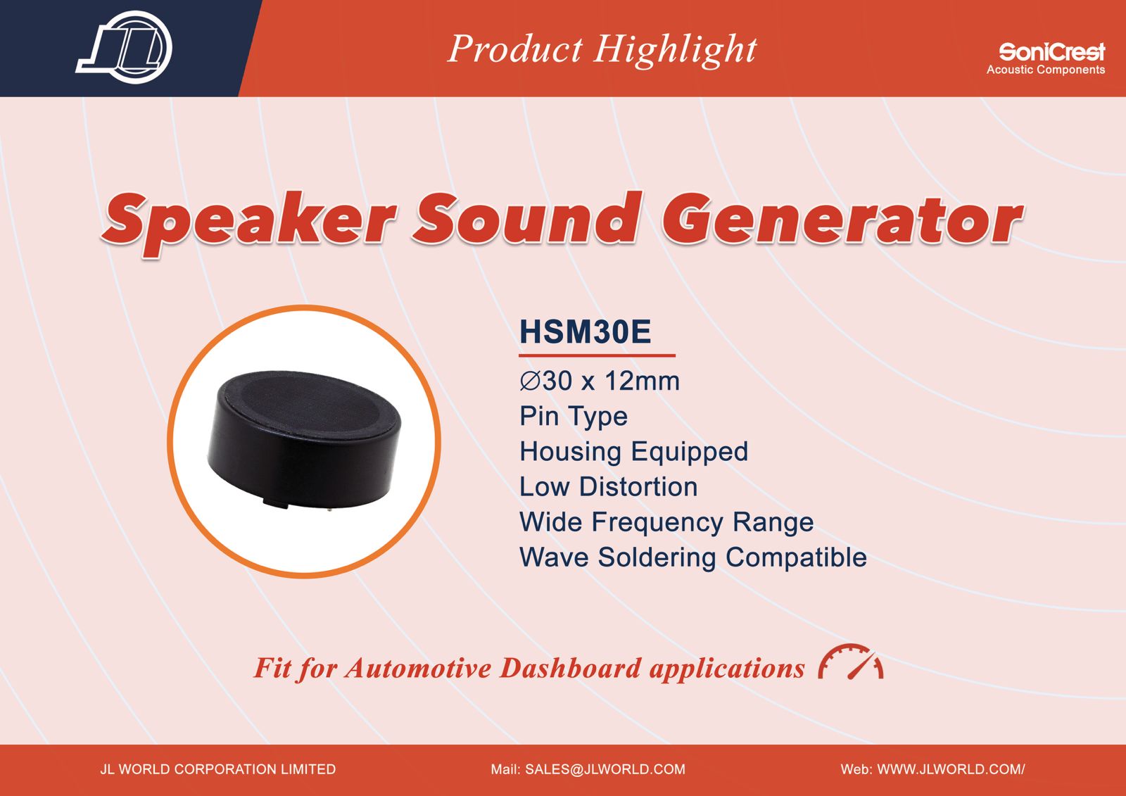 HSM30E is a housed speaker sound generator with through-hole mounting, specifically designed for automotive dashboard applications. Unlike traditional buzzers, it can produce a wide range of audio signals, offering greater flexibility in usage. Additionally, it supports wave soldering, which helps accelerate the manufacturing process and improve product reliability. For more information, please contact us at sales@jlworld.com.